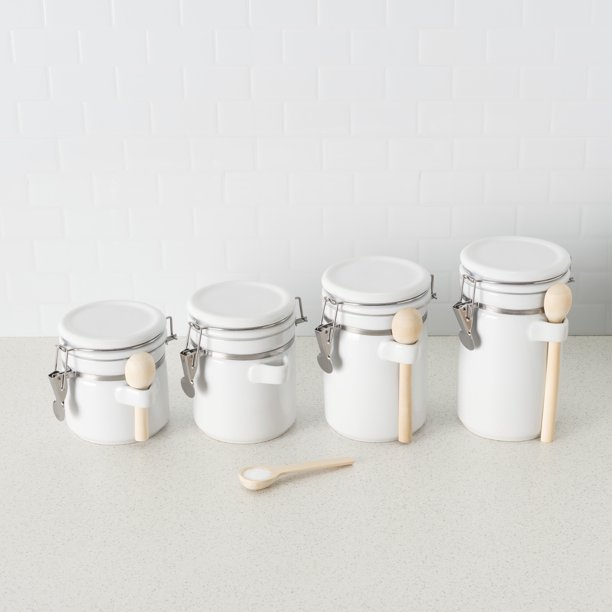 canister sets for the kitchen (4 piece set) white, high gloss ceramic | by home basics | decorative| with wooden spoons,. 4/5 (1,522) 4/5 (1,522) check out our white ceramic canister set selection for the very best in unique or custom, handmade pieces from our jars &. canister set is crafted from paper mache material with mango wood lids and metal knobs at the top to add style and functionality to your countertops. malacasa series reg, tea coffee sugar canisters set of 3, 550ml 1120ml 2200ml ceramic kitchen canisters, white canister.